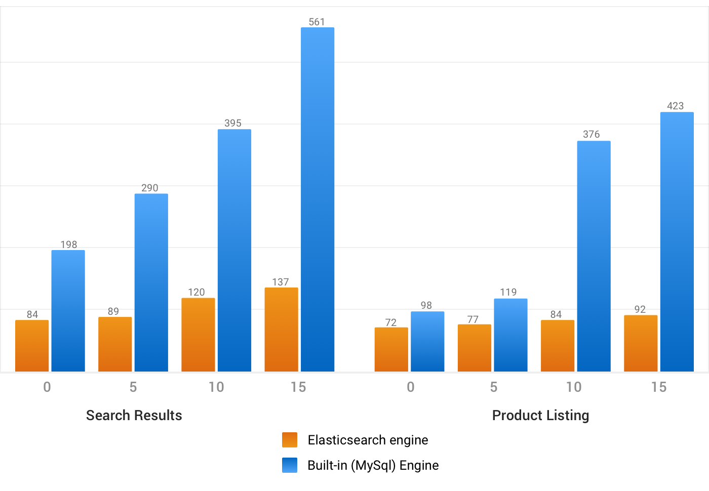 Comparison between Elasticsearch and the Default Magento Search. Numbers represent SQL queries of the layered navigation block (lower numbers equal higher page speed)